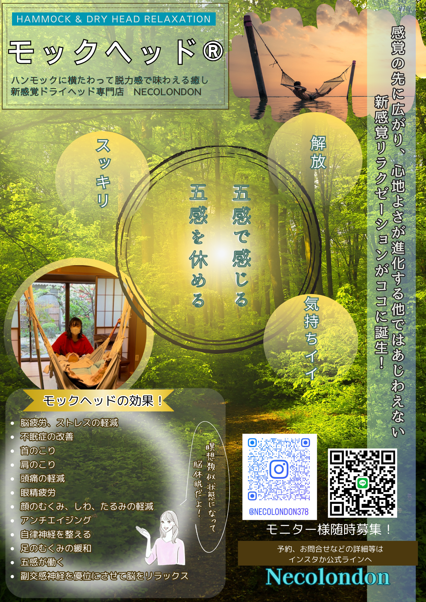 ハンモック×ヘッドマッサージ”モックヘッド”体験が出来ます。3秒でふっと全身の力が抜け脱力の中で受けるヘッドマッサージで心と体が整う新感覚リラクゼーションです。
