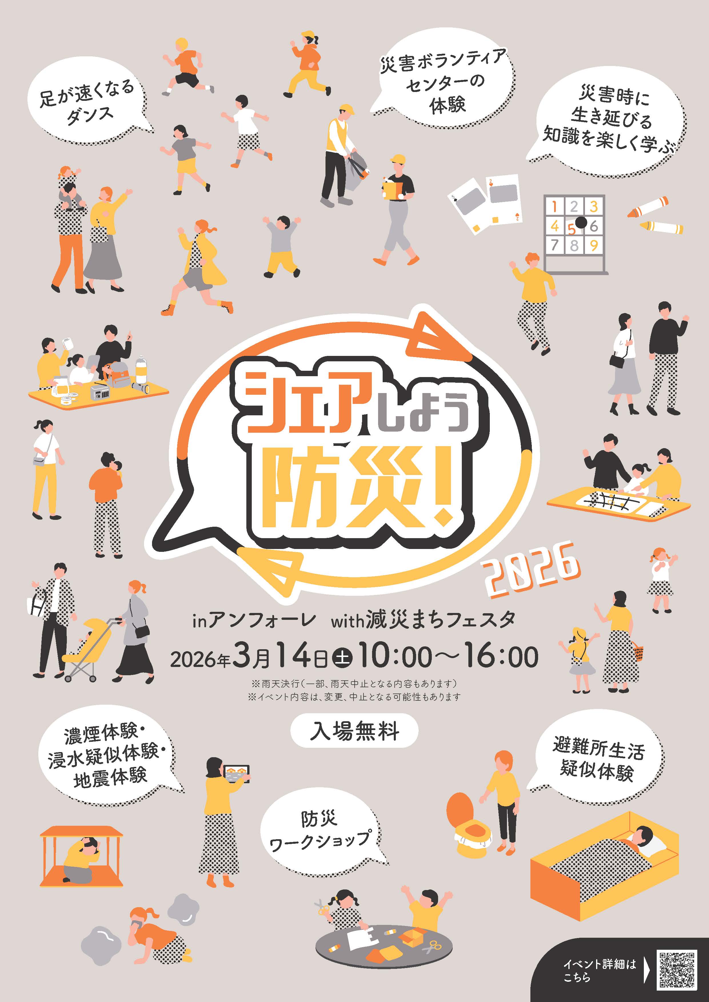東日本大震災から15年。 みなさんで「防災」をシェアしませんか?遊びながら、楽しみながら「防災」を考えましょう! ・防災ジャパンダ ・防災ワークショップ(紙食器づくり、ポリ袋ポンチョづくり、毛布で担架トライアルなど) ・ひなんじょサバイバル ・避難所生活疑似体験 など 開催日時:2026年3月14日(土)10時~16時 開催場所:アンフォーレ