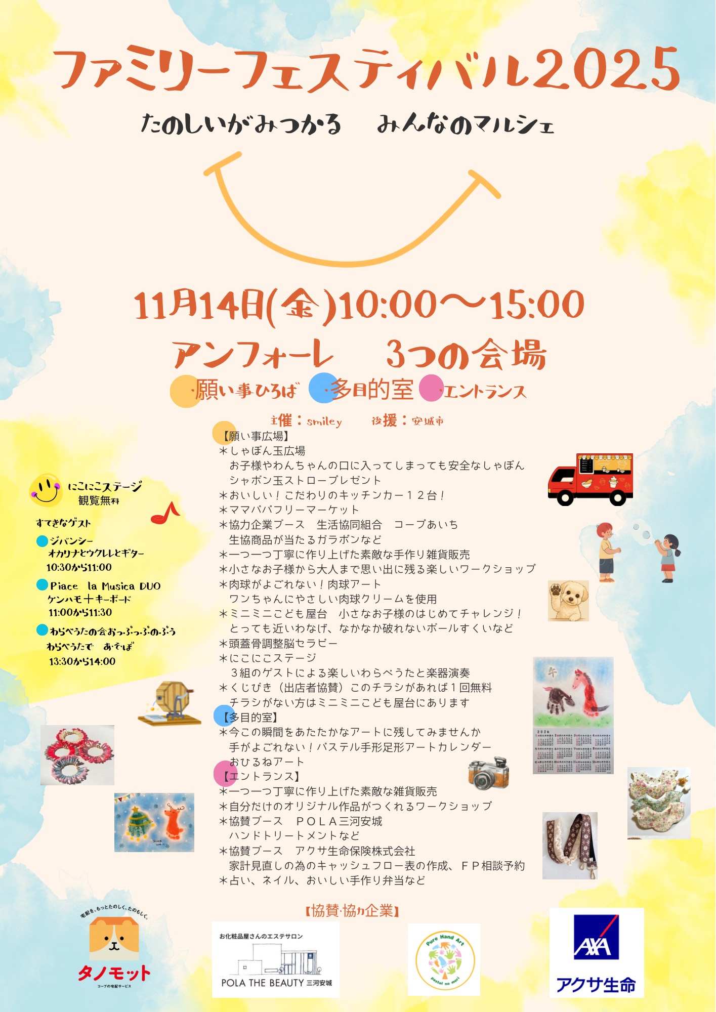 楽しいが見つかるみんなのマルシェ♪おいしい!こだわりのキッチンカー12台!入園入学グッズやアクセサリー販売、楽しいワークショップ、おひるねアートやワンちゃんの肉球アート。輪投げやボールすくいなど、楽しいこといっぱい♪楽器演奏などのステージもあります♪家族みんなでゆっくりお楽しみくださいチラシにくじ引き券が付いています
