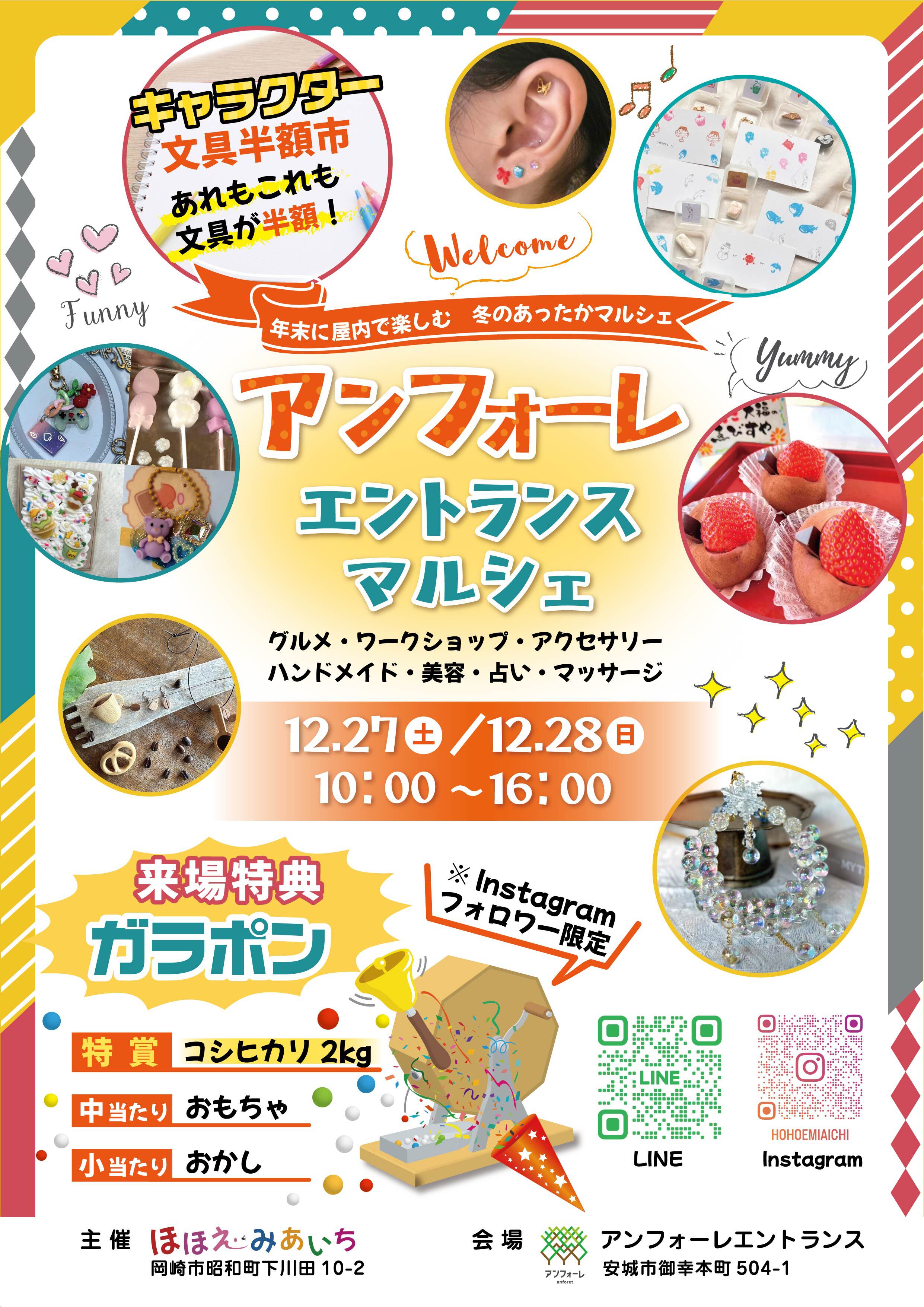 年末に室内で楽しむ、冬のあったかマルシェ『アンフォーレエントランスマルシェ』グルメ、ワークショップ、ハンドメイド、アクセサリーなど楽しむことができます。キャラクターの文具・雑貨がどれでも定価の半額の『キャラクター文具半額市』も見逃せない。