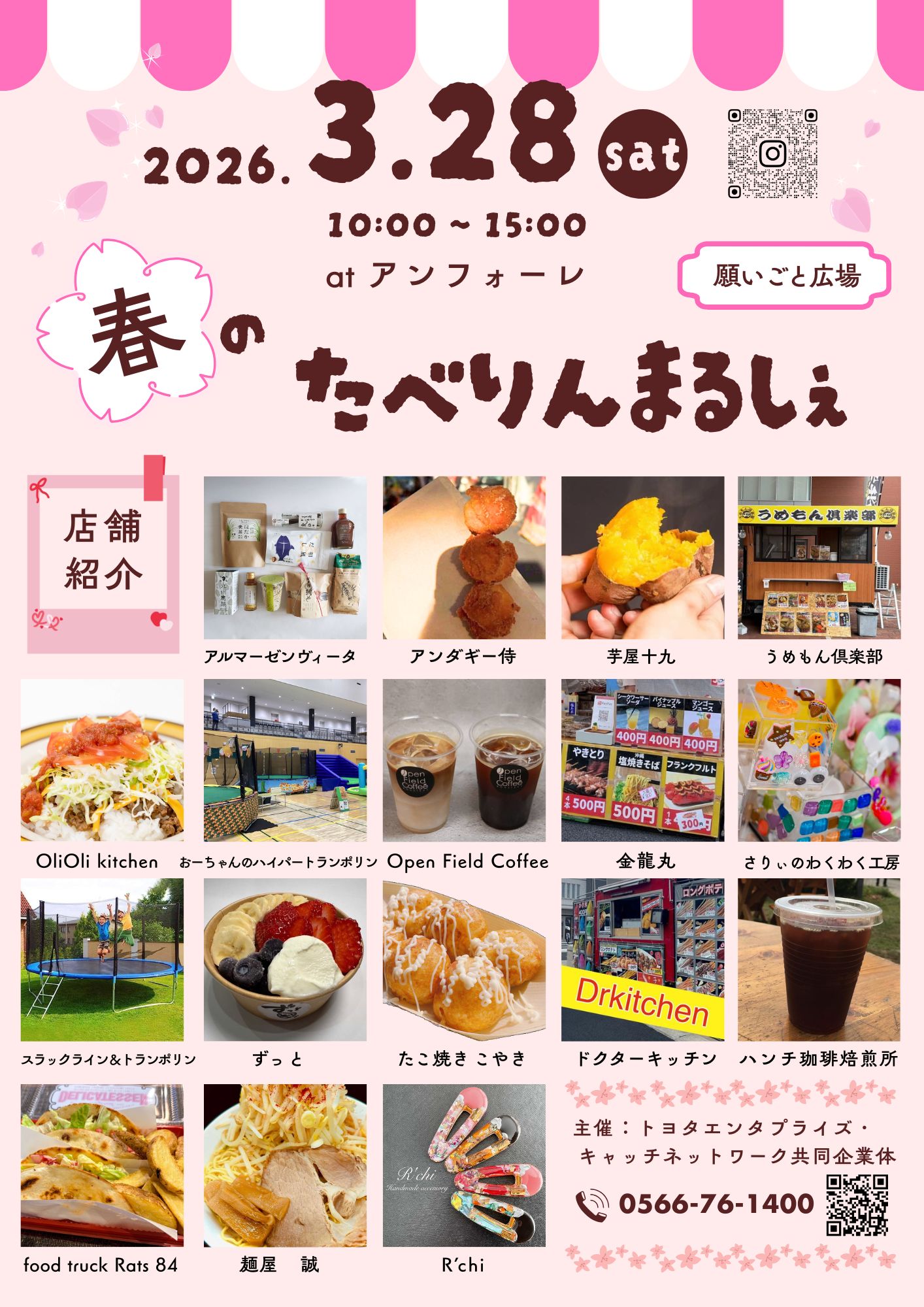 アンフォーレ初出店のお店も多数!アンフォーレで春を満喫!ぜひ遊びに来てくださいね!出店店舗はしたの関連資料にのってるよ!ぜひ見てね!※スラックライン&トランポリンは諸事情により出店できなくなってしまいましたので予めご了承ください。